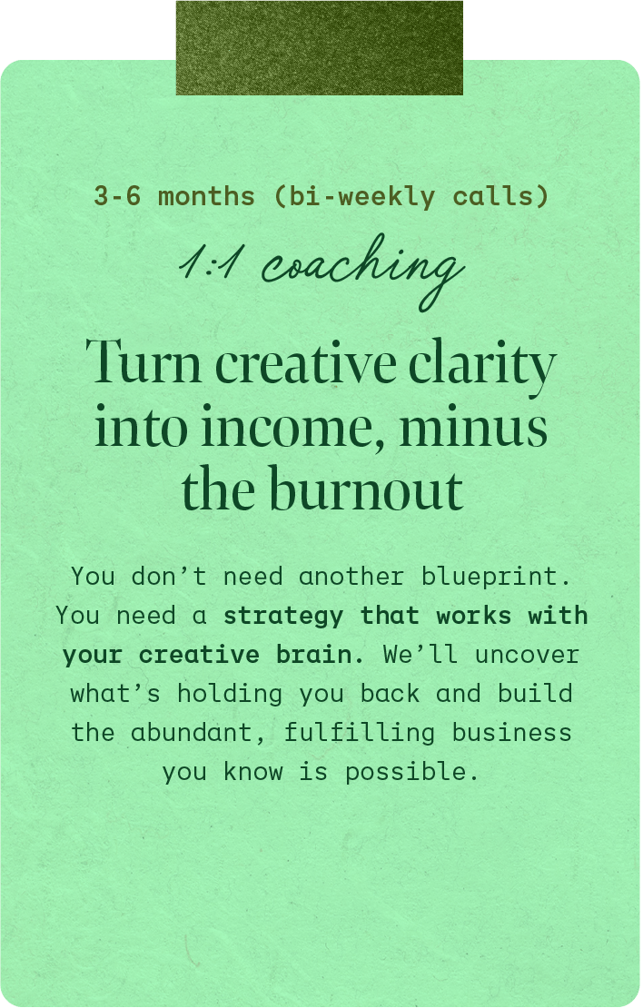 She knows what it’s like to have a brain bursting with brilliant ideas, and how to help you untangle them, trust yourself, and build a life (and business) you’re wildly proud of.